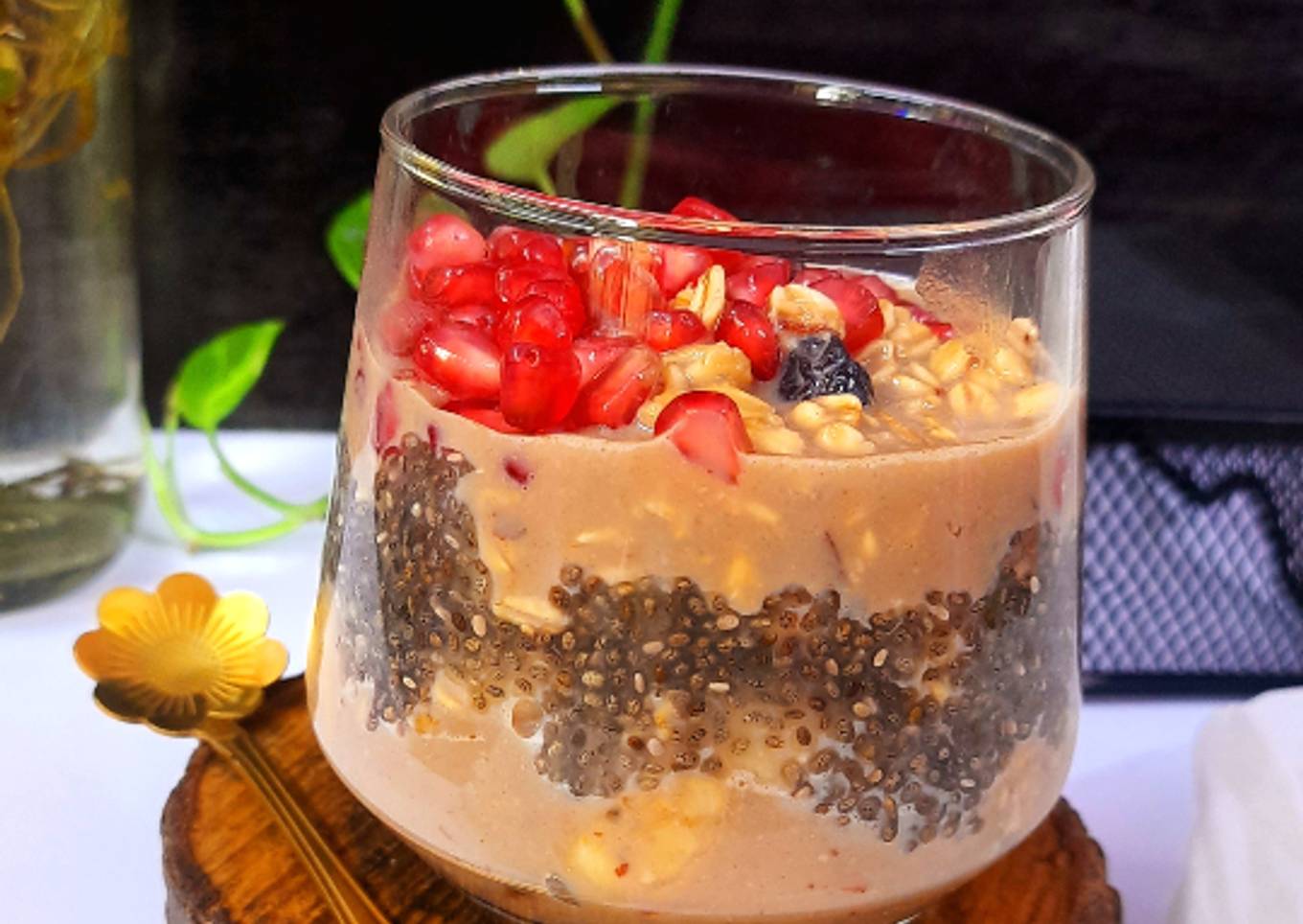 To make it more visually good.in see-through glass make a layer of apple pieces then soaked oats mix then soaked chia seeds and cover them with remaining oats finally garnish with pomegranate.