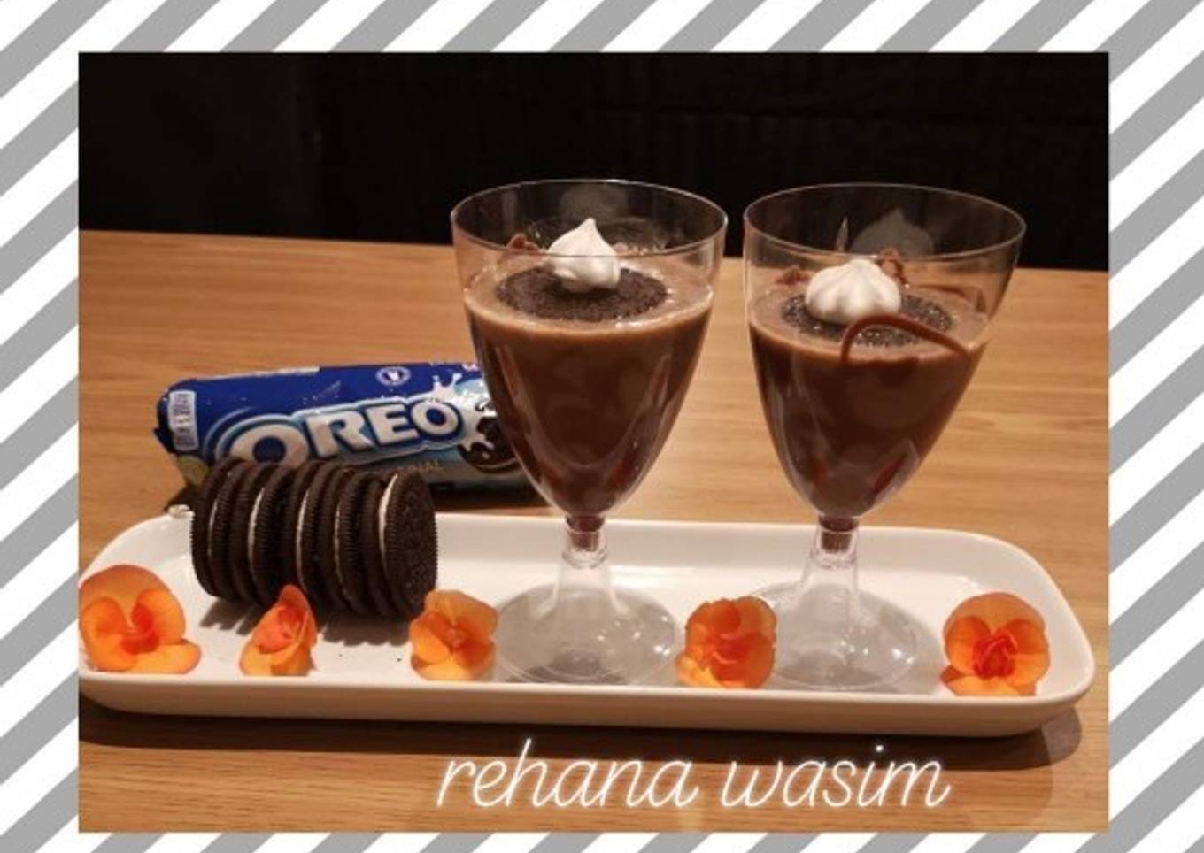 - Pour in glasses and top with cream and oroes crushed. I used chocklate syrup and drizzle it randomly on a glass n let it set before pouring
