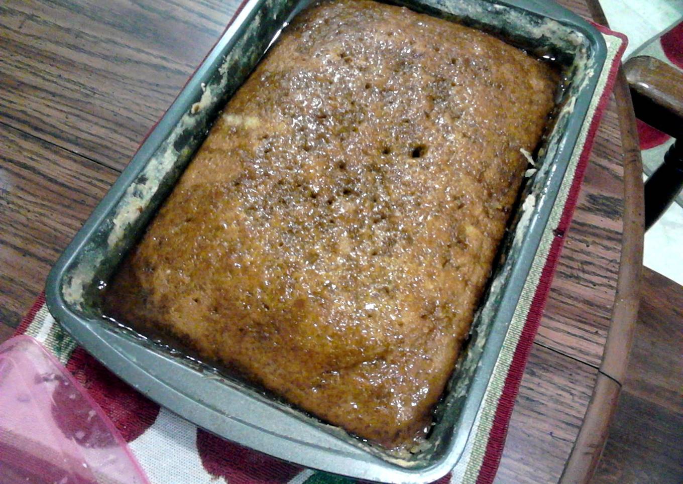 - ok now for the glaze add butter to a medium sauce pan when its melted completely add coffee, sugar, brown sugar, together bring it to boil and let it boil for 3 minutes then add 1 tsp of cornstarch to it and let boil for another 3 minutes when the cake is cool poke holes in it with a toothpick and pour glaze on top then its ready to serve.