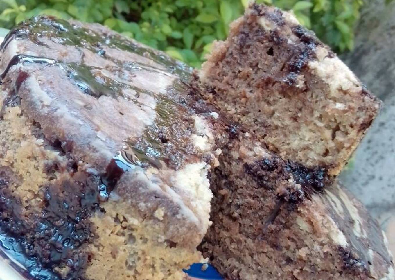 - Pour both batters in each pan, alternating both to form a swirl of both cake batters in each pan. Bake for 45minutes on medium heat, or till a toothpick inserted in the centre of both comes out clean. Remove from heat & run a knife round the edges & allow to cool a bit before removing from the pans, poke holes in the cake using a skewer & pour the chocolate & coffee syrup over the cakes, & then allow to cool.